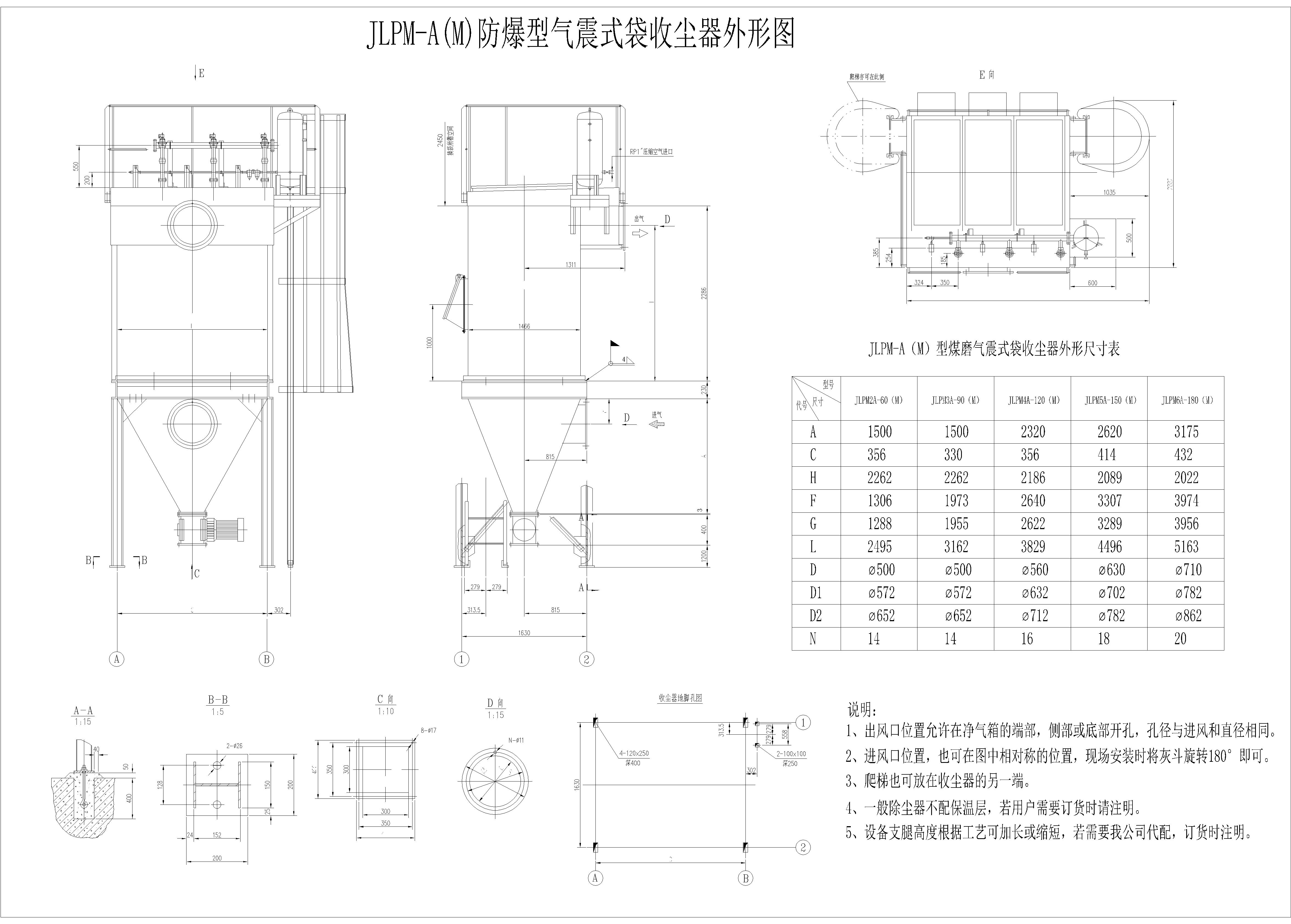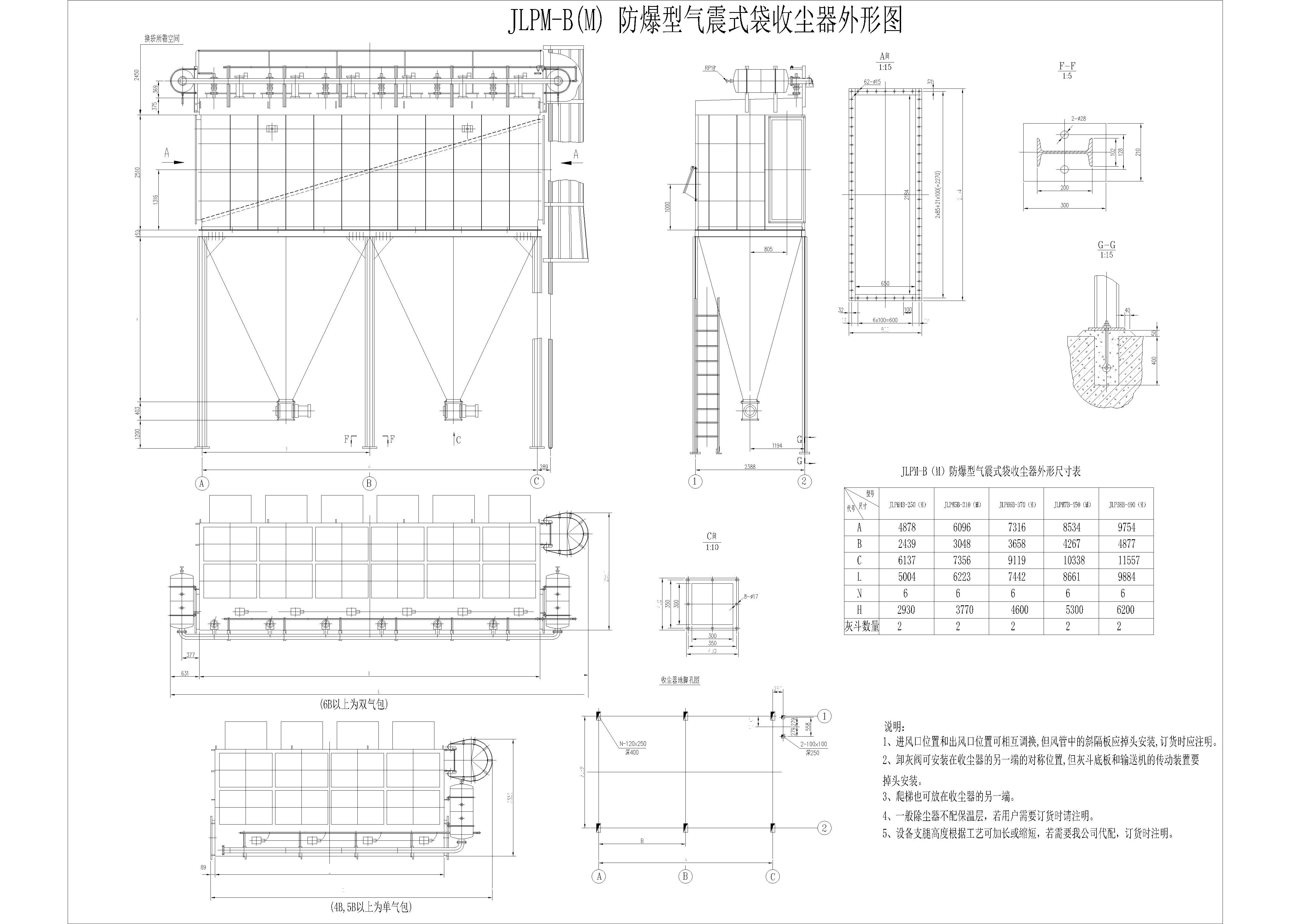 JLPM(M)型氣震袋收塵器具有四個系列33種規格。濾袋直徑均為130mm,濾袋長度有2500mm和3050mm二種。