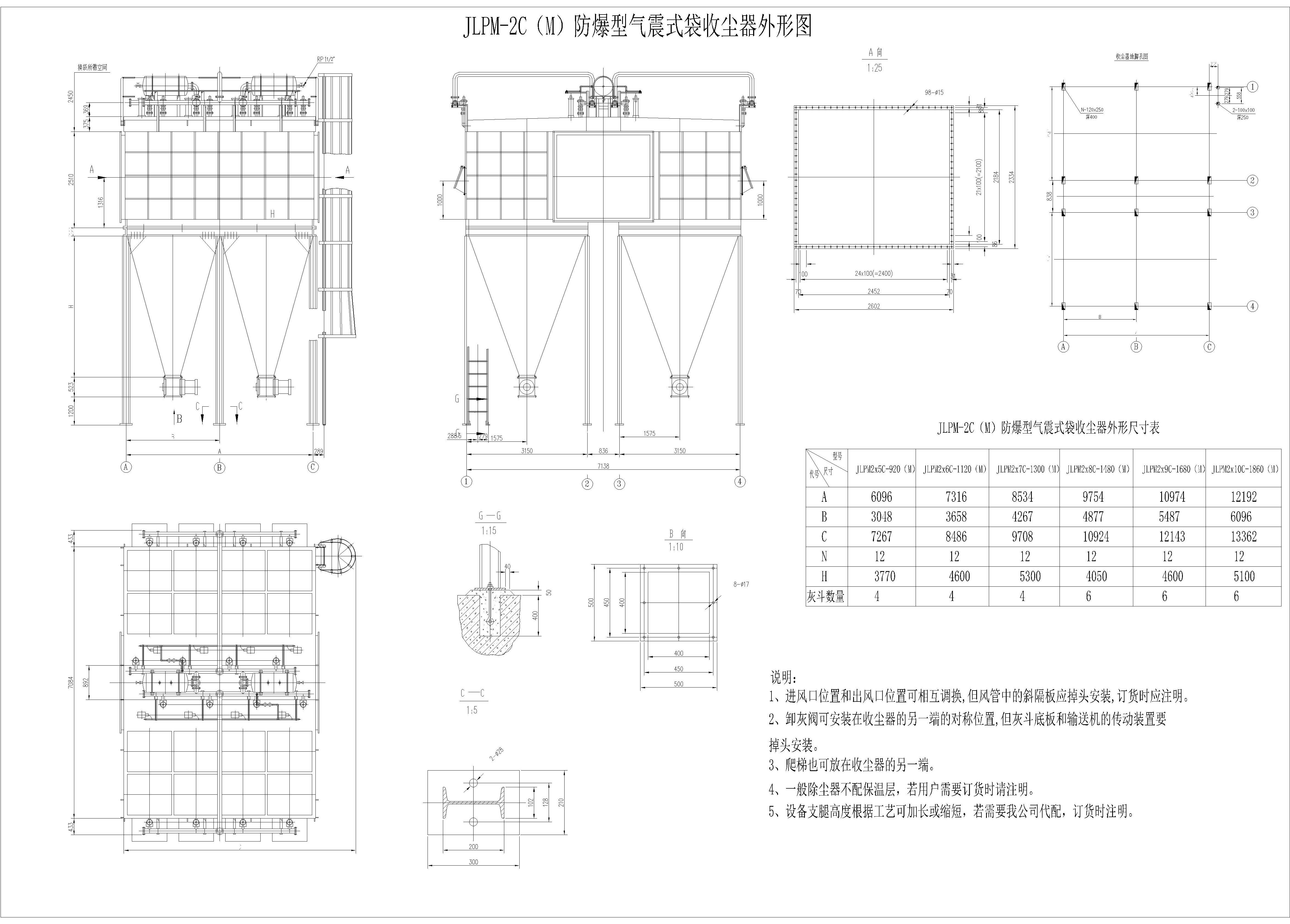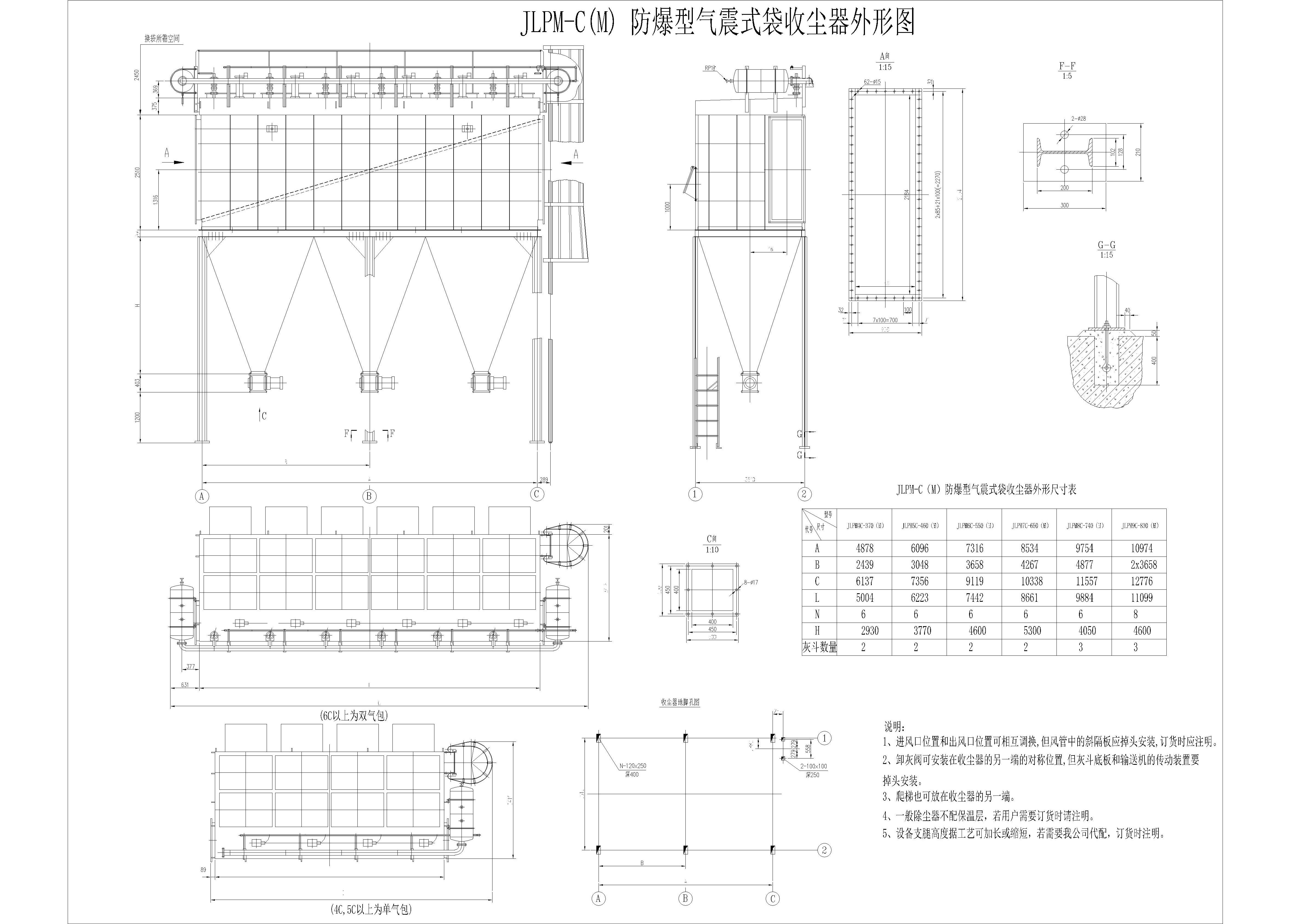 - 清灰柜的電源,卸灰裝置的供配電、至收塵器的各種配線,收塵器的照明均由用戶自理,本公司不負責供應。